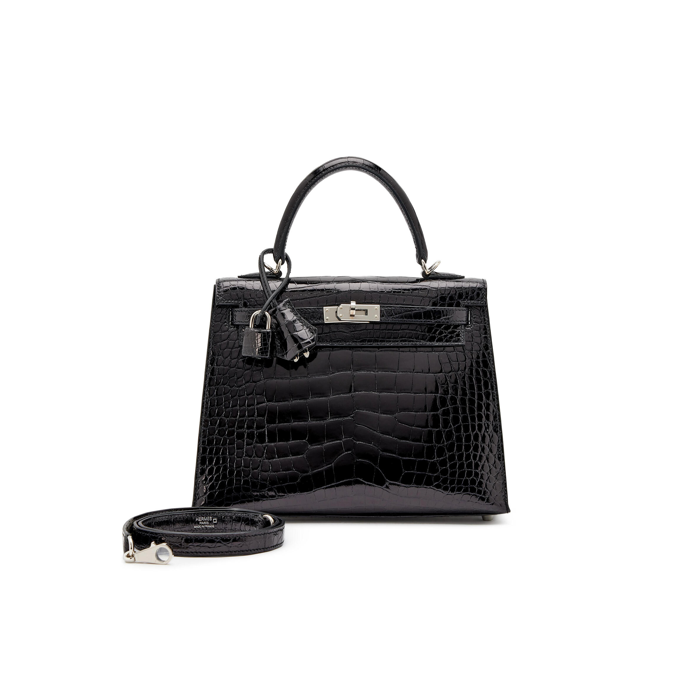 H**me5 MASTER BLACK SHINY ALLIGATOR KELLY 25 SELLIER PALLADIUM HARDWARE (25*17*7cm) Master Quality
